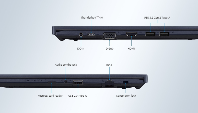 Connectivity is especially important in a business laptop to handle all workloads. ASUS ExpertBook B1 is packed with a comprehensive selection of I/O ports, including the industry-leading Intel ® Thunderbolt ™ 4 for lightning-fast, up to 40 Gbps data transfers, video output with support for two displays and fast-charge capability. It also has two USB 3.2 Gen 2 and a USB 2.0 Type-A, HDMI 2.0, Ethernet and a microSD card slot — so it’s primed and ready for the today’s remote-working paradigm. For enhanced reliability, the solidly constructed ports are test to endure over 10,000 insertions
