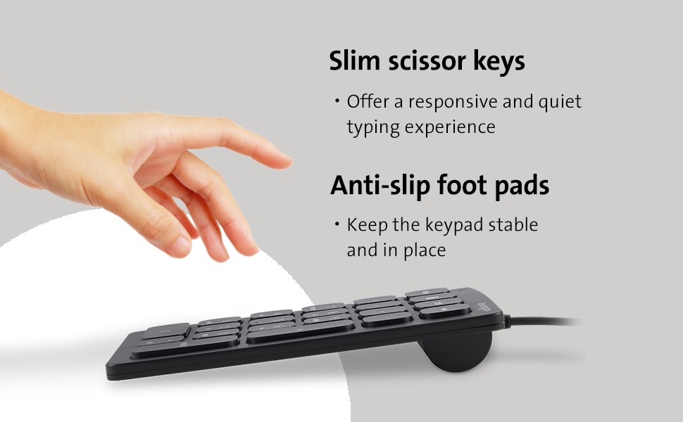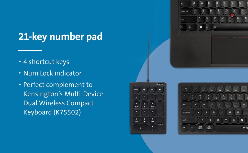 many laptops and compact keyboards do not include a number pad. The Wired Numeric Keypad, a perfect complement to our Multi-Device Dual