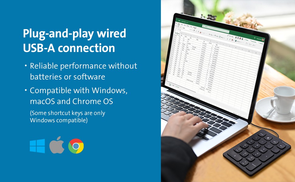 Wireless Compact Keyboard (K75502) and allows Windows, Mac and Chrome OS users to input numeric data quickly and easily. Slim scissor keys