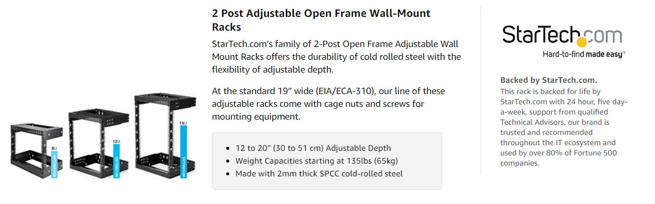This adjustable rack’s depth expands from 12 inches (30cm) to 20 inches (51cm) . These depths are ideal for rack-mount network switches or equipment of similar depths.