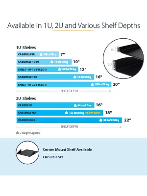 StarTech.com’s line of solid rackmount shelves fit universally into any EIA-10 19” wide rack or rack cabinets. Available in the a variety of depths and U heights, these racks are made of durable cold-rolled steel to accommodate a variety of equipment.