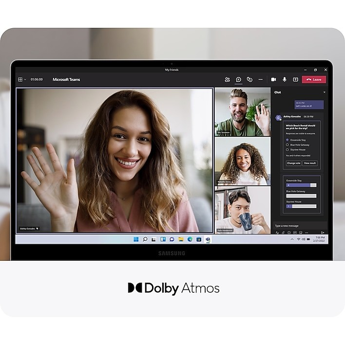 Show up like you mean it with Galaxy Book2 360, now with optimized video calls that help you look and sound your best in meetings. From a virtual work session to an impromptu chat with friends or family, let your personality sparkle with an HD camera that’s super crisp and clear. Keep the spotlight where you want it—namely, on you—with auto framing that automatically keeps you in focus and background effects that remove visual distractions in your background. You’ll sound amazing too with upgraded Dolby Atmos stereo sound and intelligent noise canceling that helps to minimize unwanted sounds.