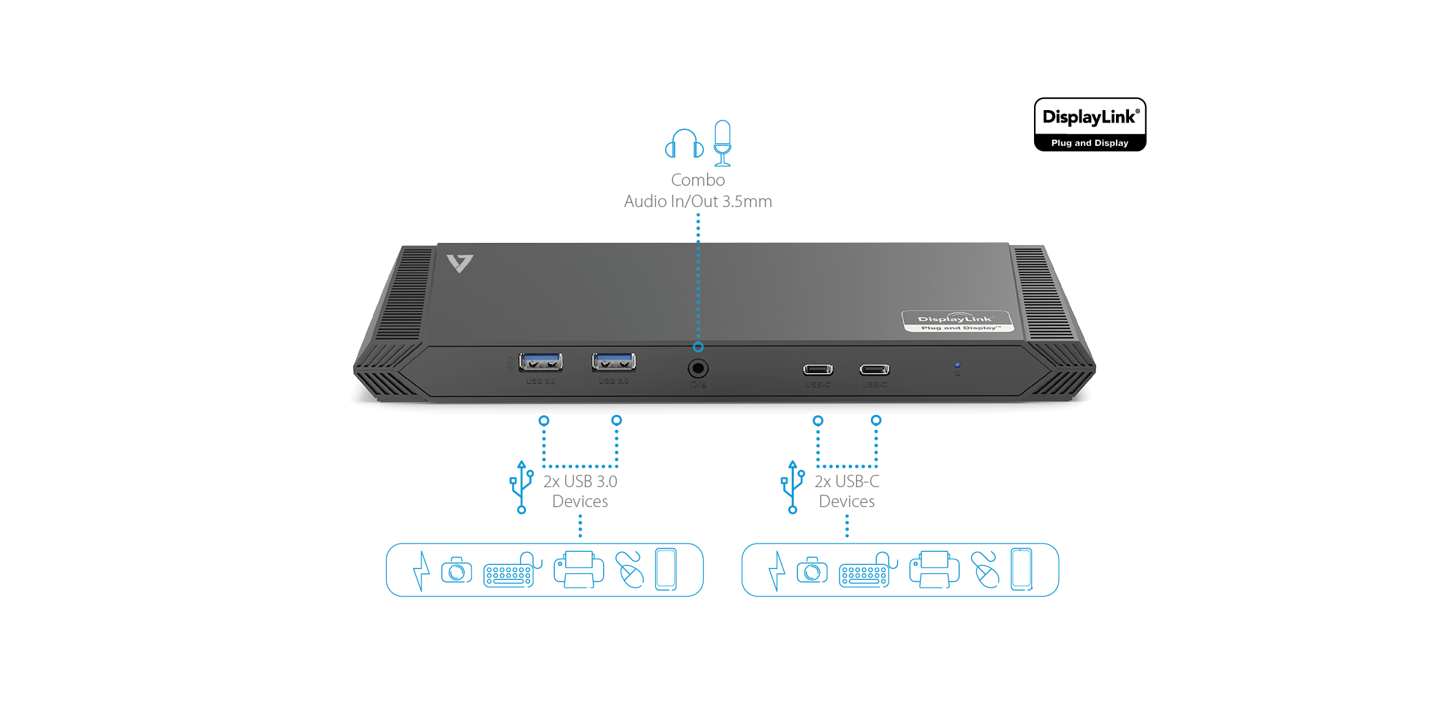 The Universal USB-C Docking Station from V7 adds displays, USB ports, audio and network connectivity to your computer easily while charging your computer from one included cable. It adds 1 x DisplayLink HDMI, 1 x Alt Mode HDMI, DVI, 4 x USB A 3.2 Gen1, 2 x USB-C, Audio and Gigabit Ethernet connection while charging your computer up to 65W power delivery. Extend or mirror your HDMI (4K + 2K) and DVI (2K) displays. It's Displaylink certified, with robust high performance connectivity to extend and enhance your workstation productivity with a 2 year warranty.