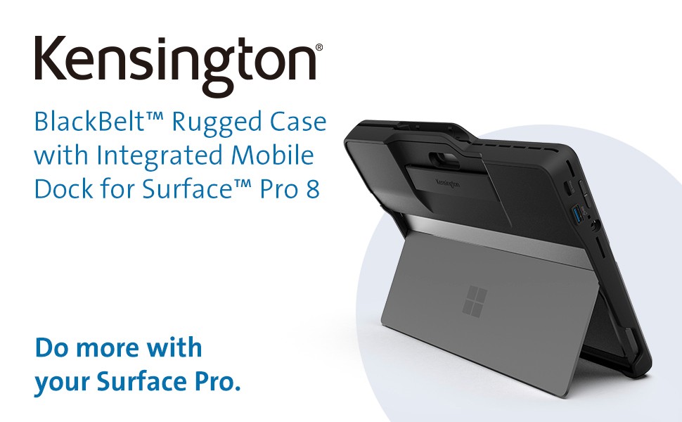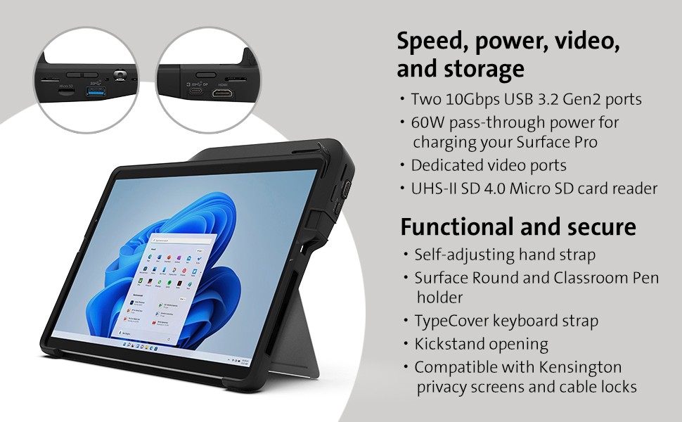 Designed for Surface™ and developed in partnership with Microsoft, the BlackBelt™ Rugged Case with Expanded Connectivity for Surface Pro 8 lets you do more with your Surface Pro. Military-grade drop and wipe down protection means this case is ready for anything, while additional ports provide expansion and connectivity options for greater productivity and creativity. Ports include (1) dedicated HDMI 2.0 port, (1) USB-A 3.2 Gen2 10Gbps port, (1) USB-C 3.2 Gen2 10Gbps port providing pass-through power of 60W (USB-C power supply not included - optional Kensington 100W USB-C Power Supply available, K33821 or DP Alt Mode video support, and (1) UHS-II SD 4.0 Micro SD card slot for expanding storage or transferring les. Additional features include compatibility with Kensington privacy screens, a protective camera cover, cable lock compatibility, a self-adjusting hand strap, Standard Surface Round and Classroom pen holder and tether, kickstand opening, keyboard holder, and a TypeCover strap.