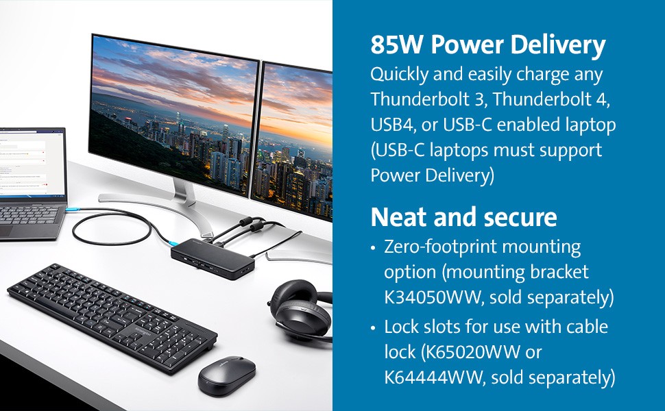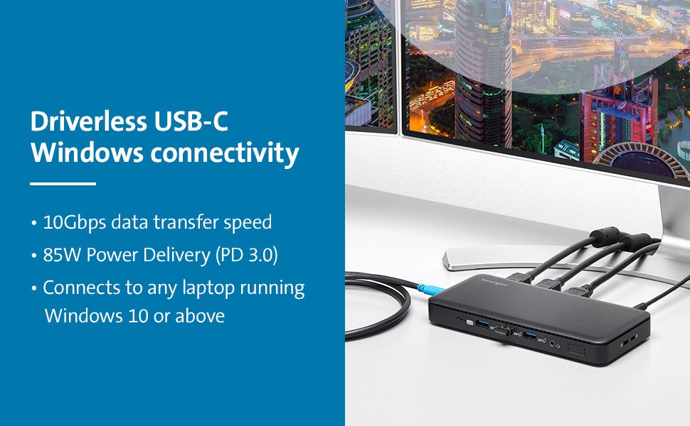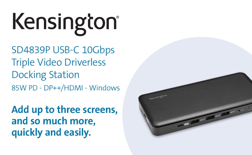 If you’re looking for a driverless USB-C docking solution that offers triple video, 85W Power delivery, and data transfer speeds up to 10Gbps, then the SD4839P is for you. Simply connect it to any USB-C laptop running Windows 10 or later, and choose the right connections and resolutions for your needs. Nine-in-one design features plenty of ports for all your connectivity needs, while a zero-footprint mounting option and security cable lock slots let you maximize desktop space, reduce clutter, and protect your investment. Free DockWorks software.