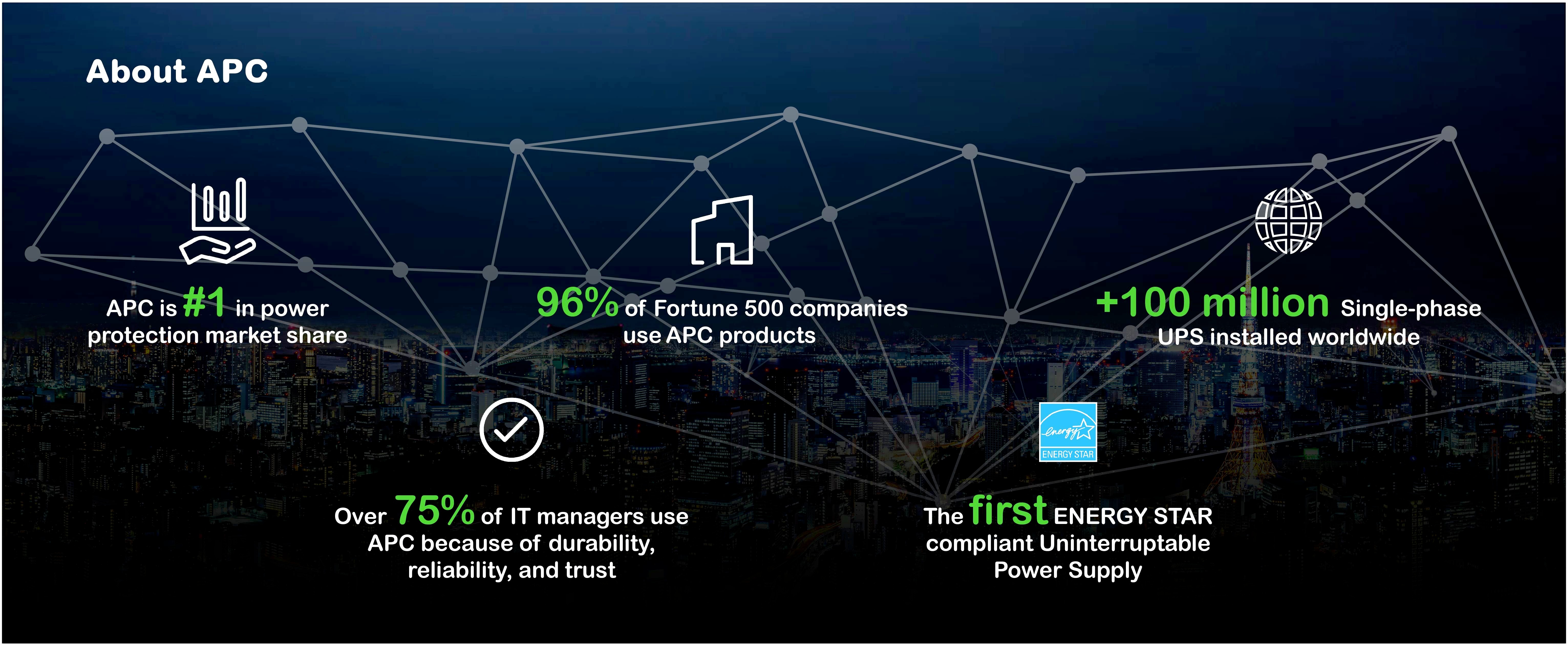 APC, a flagship brand of Schneider Electric, provides clean battery backup power, surge protection, and IT physical infrastructure inside and outside the traditional IT environment. Through our APC brand products and solutions, we offer certainty in a connected world. Certainty that our reliable, integrated physical infrastructure solutions are based on the fundamental premise that your data and information should — and always will be — accessible.