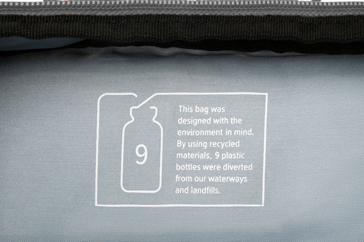 This bag was designed with the environment in mind. By using GRS-certified recycled materials, 9 plastic bottles were kept out of our waterways and landfills, shredded into small flakes, re-polymerized into plastic pellets, and heated and spun into yarn that was stitched, and sewn into the fabric of this EcoSmart® bag.