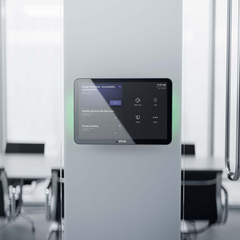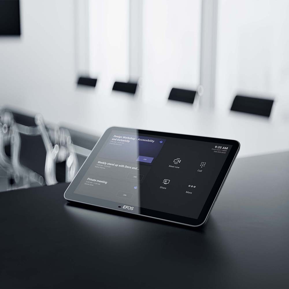 Using the tablet as a meeting room controller, it easily pairs with EPOS video conferencing solutions, providing frictionless meetings. Using it as a wall-mounted scheduling panel, you can view location and meeting details and reserve available meeting spaces on the spot.