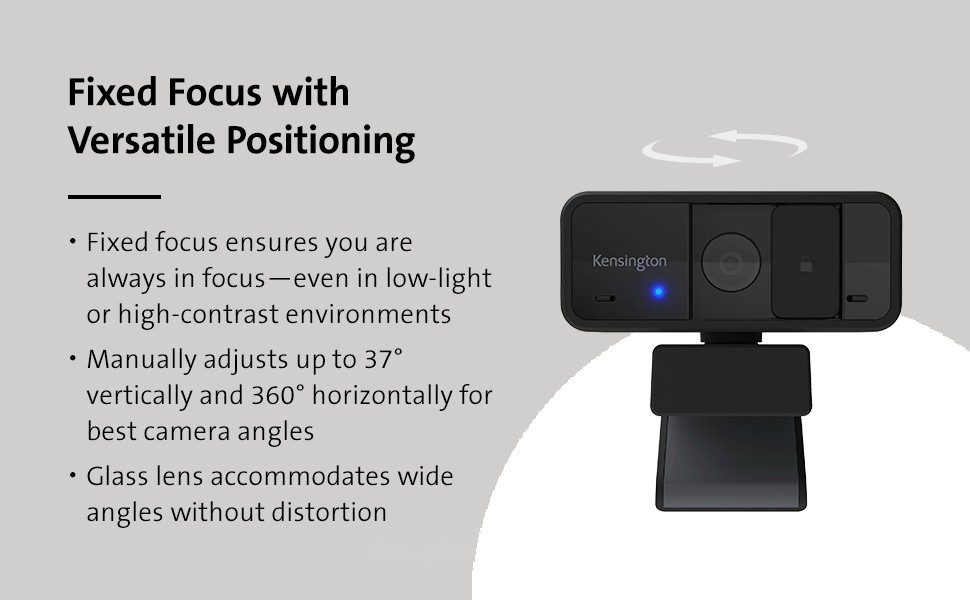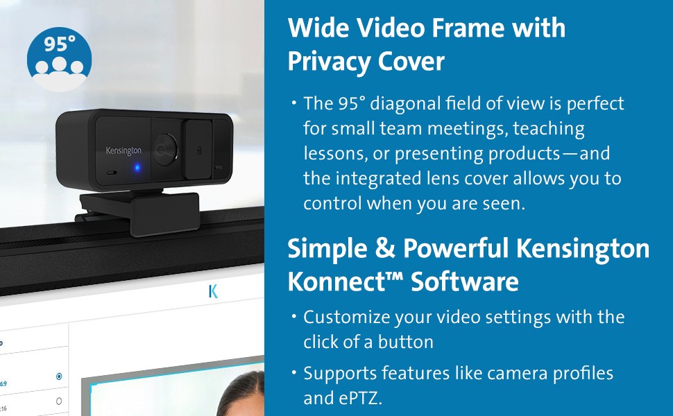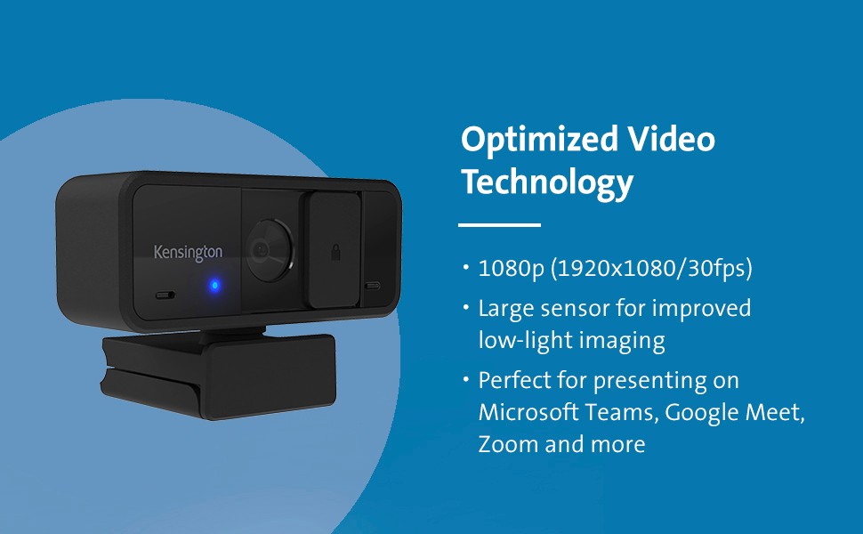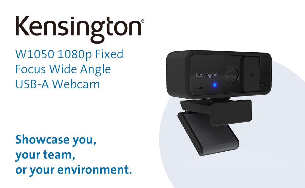 Kensington’s W1050 1080p Fixed Focus Wide Angle USB-A Webcam is a professional and cost-effective webcam delivering high-quality video (1080p @ 30fps), omnidirectional microphones, and unique features for privacy, camera placement, and improved low light imaging. The W1050 is optimized to help you look and sound your best on today’s most popular video conferencing applications and is part of Kensington’s Professional Video Conferencing ecosystem—a powerfully cohesive software and accessory experience that empowers you to spend more time collaborating. Whether you’re working from home or from the ofce, needing to t more people in the frame, or teaching or learning, the W1050 presents you, only better— on Microsoft Teams, Google Meet, Zoom, and more.