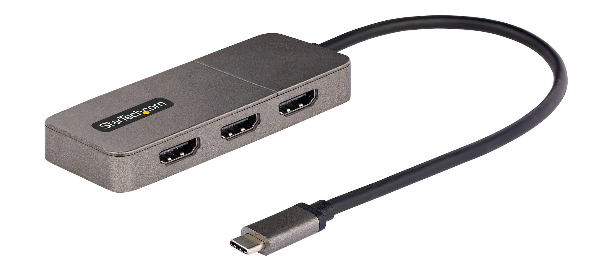 This USB-C to HDMI MST Hub enables a connection to three HDMI monitors, using a DisplayPort Alternate Mode (DP Alt Mode) capable USB-C host device.