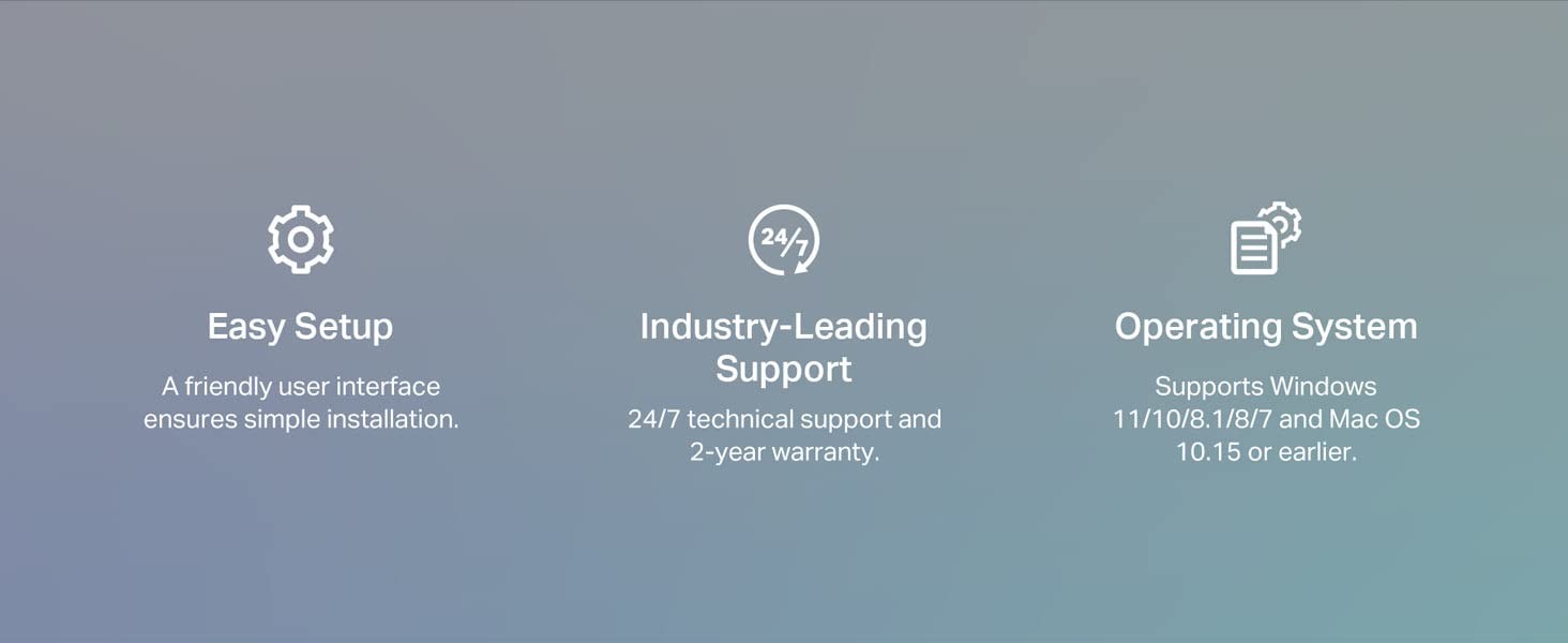 *Maximum wireless signal rates are the physical rates derived from IEEE Standard 802.11 specifications. Actual wireless data throughput and wireless coverage are not guaranteed and will vary as a result of 1) environmental factors, including building materials, physical objects, and obstacles, 2) network conditions, including local interference, volume and density of traffic, product location, network complexity, and network overhead, and 3) AP limitations, including rated performance, location, connection quality, and AP condition. *To ensure compatibility, you may need to update the adapter’s drivers after an OS update. You can find our latest drivers in the download center at tp-link.com/en/download-center.