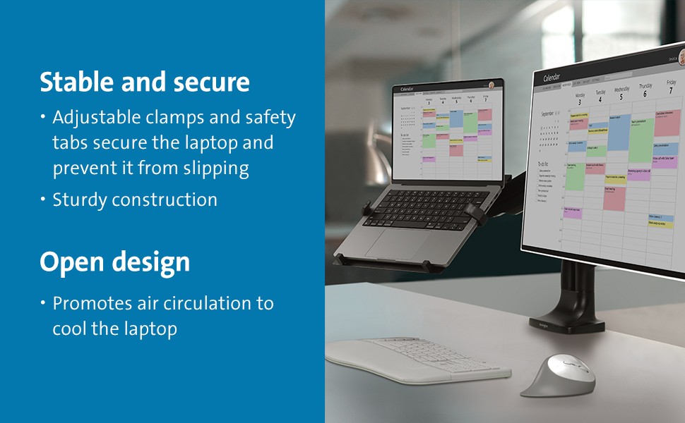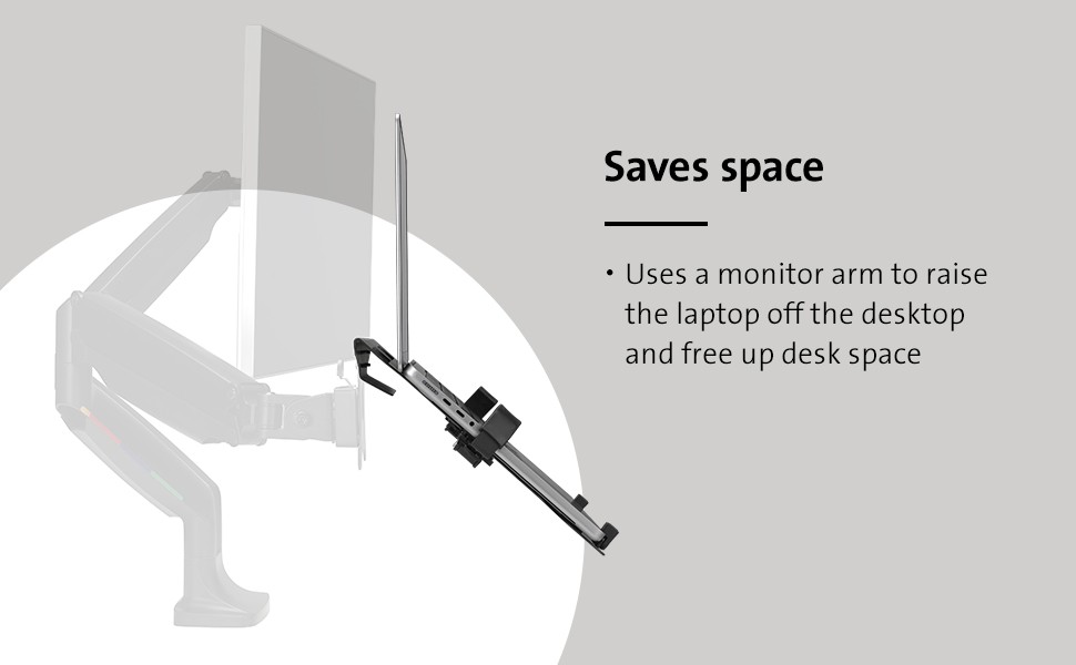 At home or in a traditional office, you want to be comfortable and productive. Many studies suggest that multiple monitors help increase productivity, including using your laptop as an additional screen. Easily raise or lower your laptop to an optimal viewing level and create an ideal desktop setup with the Universal Laptop Holder for Monitor Arms. Mounting easily to any monitor arm with a standard VESA 75/100 plate, the holder provides a stable and secure laptop platform that’s off the desk and out of the way. Strong but gentle clamps provide a stable and secure platform, freeing up valuable desk space.