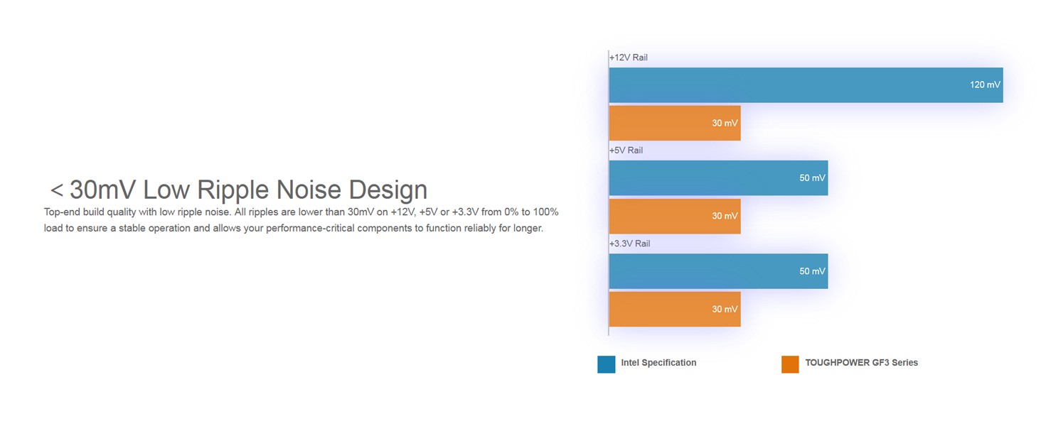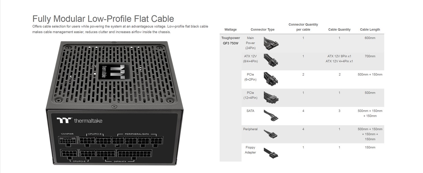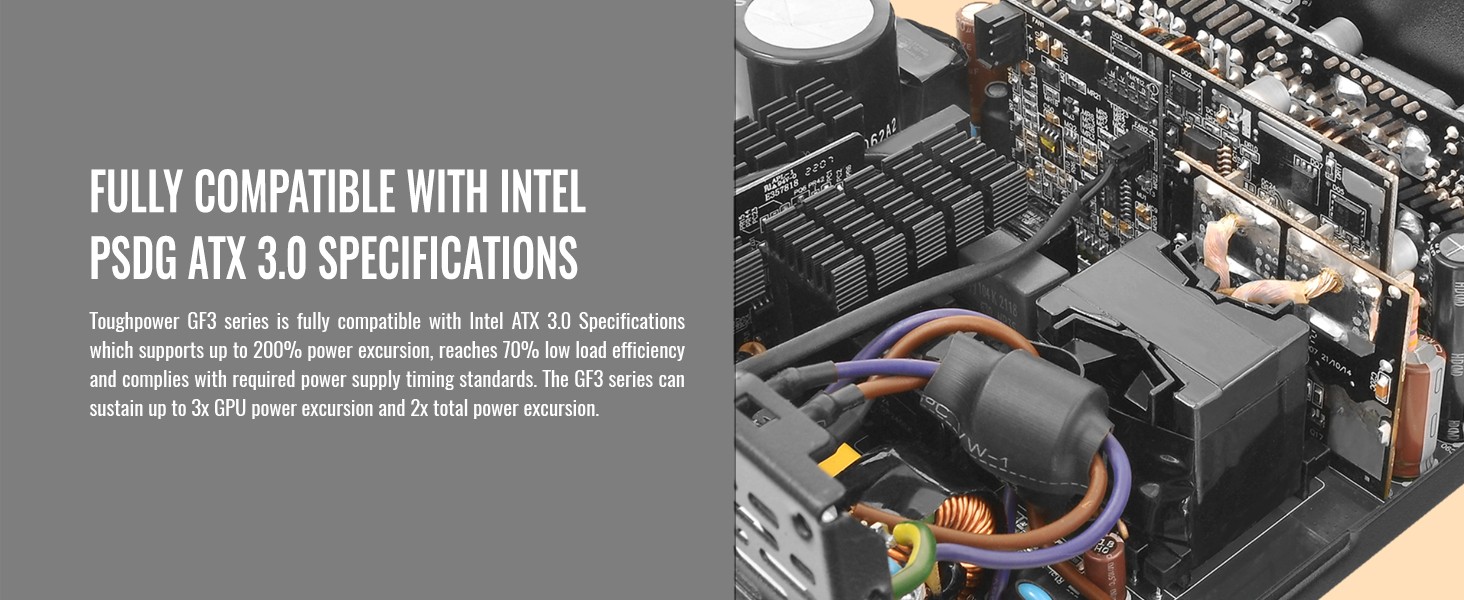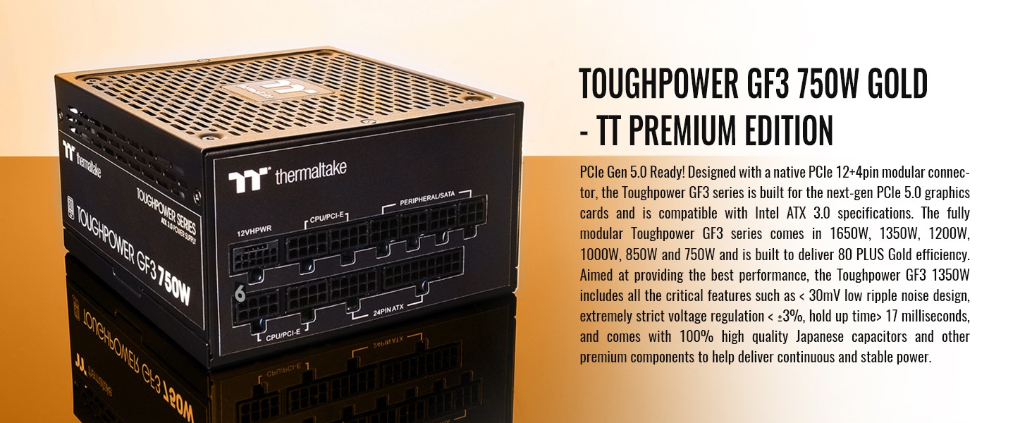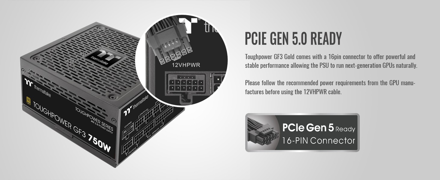 Designed with a native PCle 12+4pin connector, the Toughpower GF3 series is compatible with Intel s ATX 3 0 specification and is built for next-gen Fele 5.0 graphics cards. It can pipe up to 300W of power to PCIe 5.0 graphics cards.