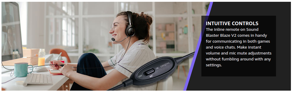 At just 187g / 6.6 oz, keep the ear fatigue at bay as the Sound Blaster Blaze V2 is lined with plush premium velvet paddings with a retractable cushioned headband that will sit comfortably on your head or around the neck, ensuring an ergonomic fit. Together with direct access to volume controls and mic mute controls via its inline remote, stay ahead in the game and truly immerse yourself with Sound Blaster Blaze V2.