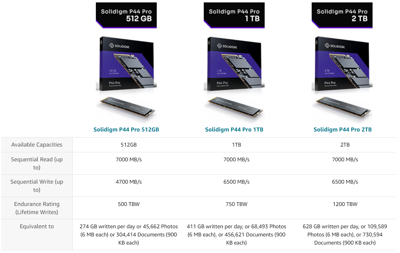 Built for lightning speed, the P44 Pro gets up to 7000 MB/s. This beast comes in capacities ranging from 512 GB to 2 TB in a sleek M.2 form factor.