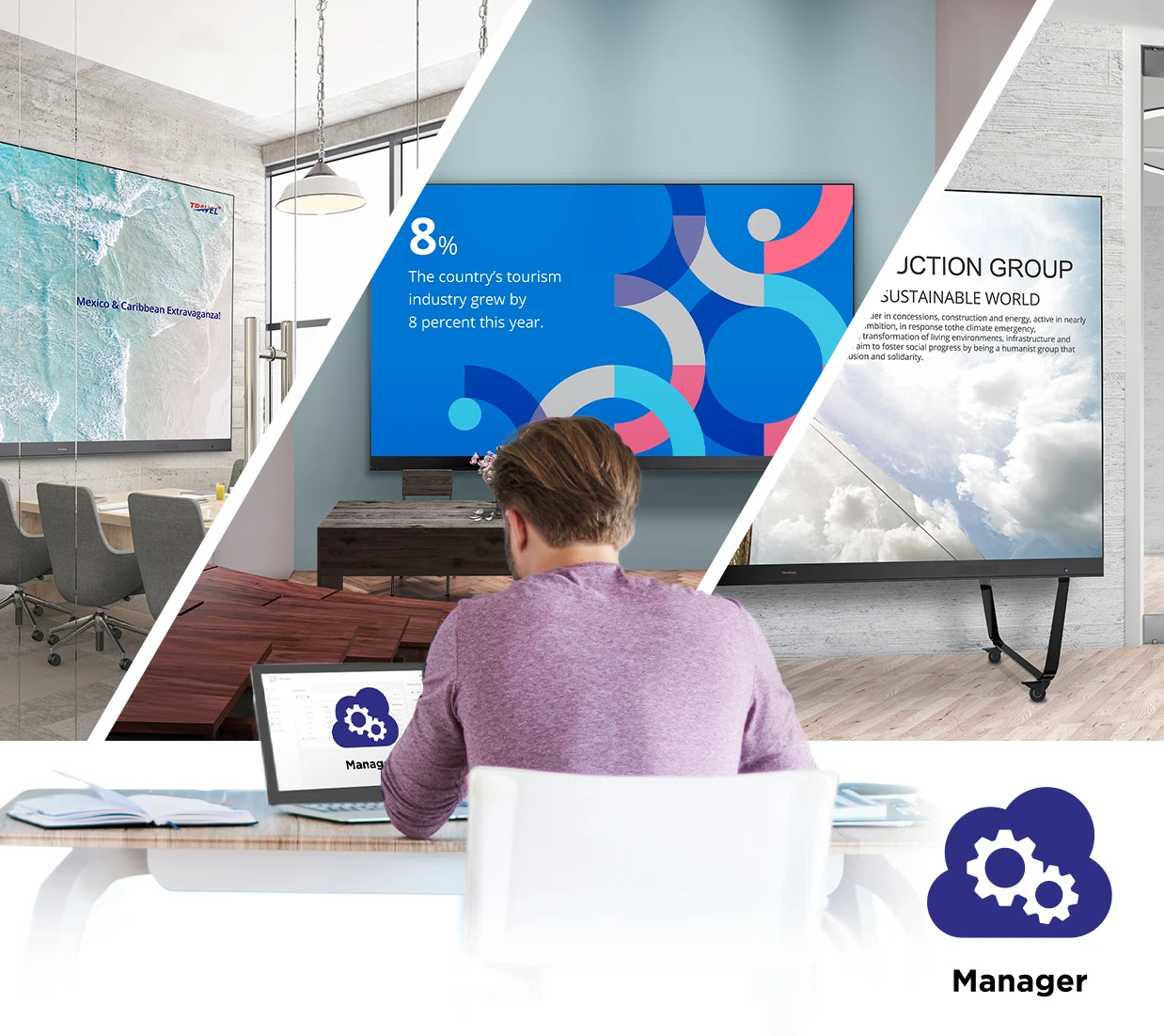 The included myViewBoard Manager™ software is a cloud-based management solution that empowers IT administrators to remotely monitor devices, manage apps, push out broadcasts and more within the myViewBoard ecosystem. myViewBoard Manager lets IT administrators seamlessly monitor and maintain individual displays across large organizations from a single control panel. For additional functionality, you can upgrade to myViewBoard Manager Advanced software.