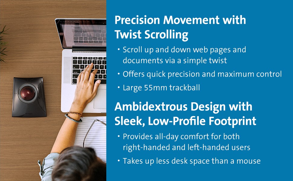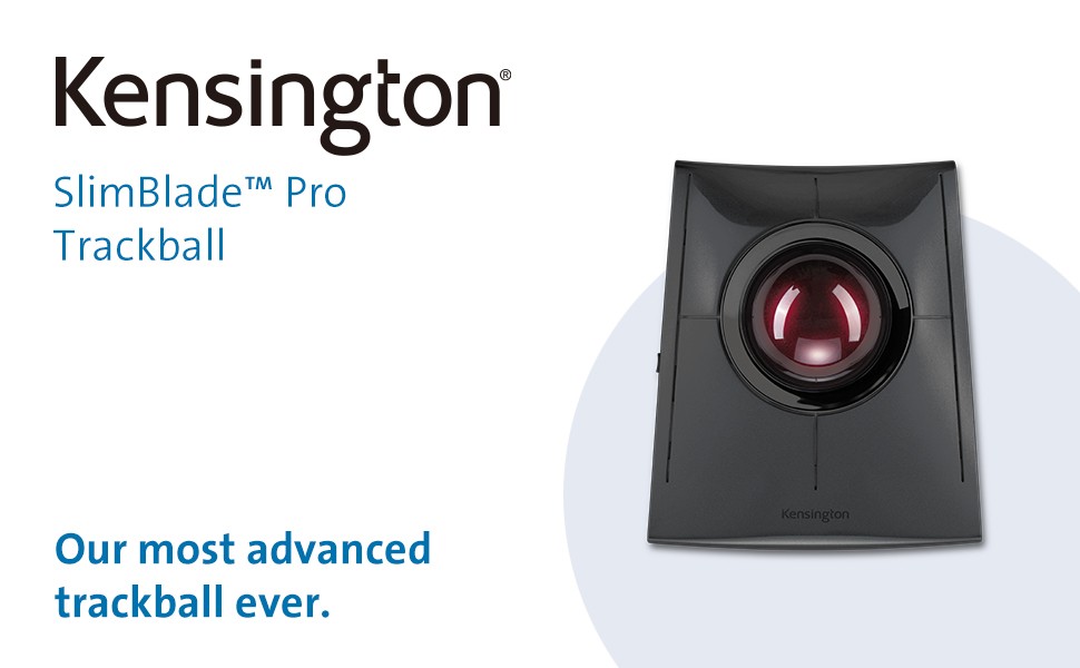 Professional reviewers and ergonomists agree that finger-operated trackballs are superior to thumb-based trackballs when it comes to precision and hand comfort. At the same time, professional users prefer the convenience of wireless controllers. Kensington has responded with its most advanced trackball yet: the SlimBlade Pro Trackball. Now you can enjoy the precision and ease of a finger-operated trackball that includes Bluetooth, 2.4GHz wireless and wired capabilities, as well as unique dual-sensor ball-twist scrolling. All in a sleek design that saves valuable desk space and can be used with either hand. It’s the ultimate in accuracy, comfort, and control.