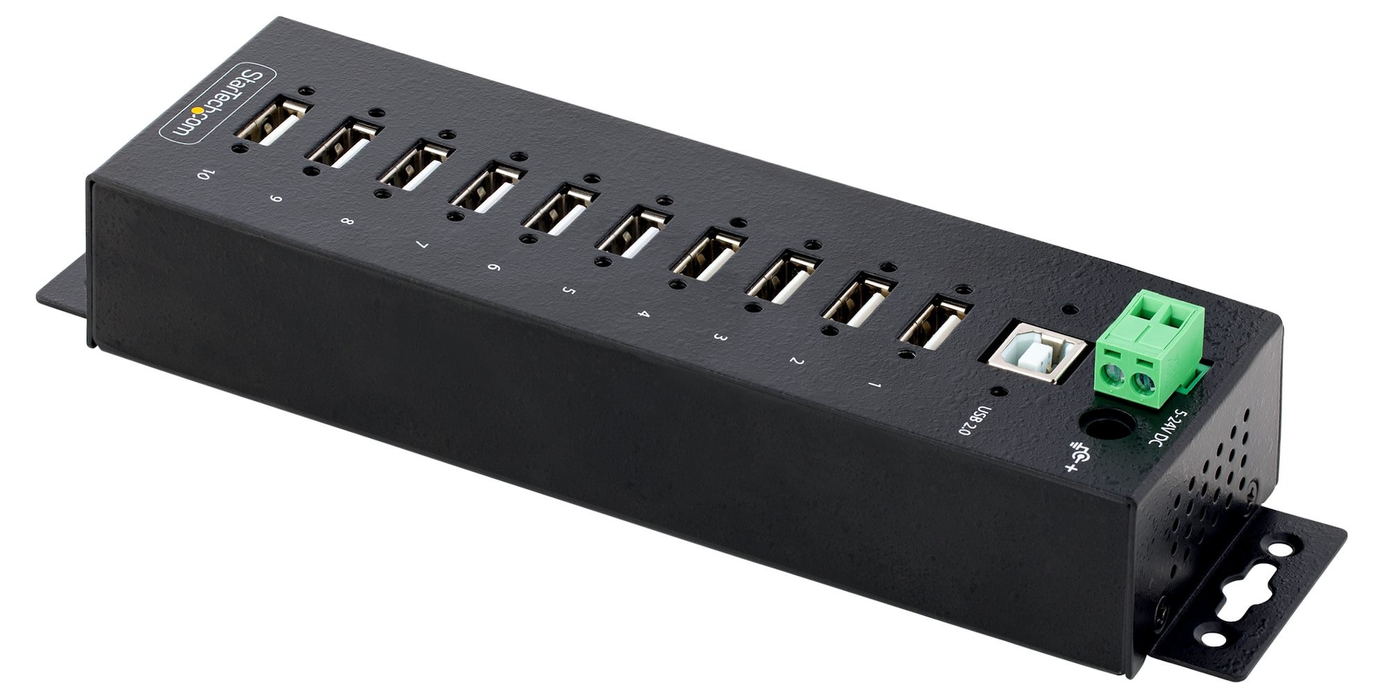 This TAA-compliant 10-port industrial USB 2.0 Hub delivers scalability and protection in harsh industrial environments by providing a high number of USB ports with ESD level 4 protection. The durable metal housing construction is ideal for industrial applications. For power connectivity, the Hub features power redundancy using the DC barrel plug and terminal block port. Finish the installation by mounting the Hub to a DIN rail using the included hardware or on a desk or wall with the built-in mounting brackets.
