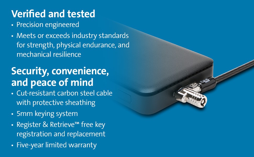 Strength tested and verified for industry-leading standards in torque/pull, foreign implements, lock lifecycle, corrosion, and other environmental conditions, the lock is backed by a five-year limited warranty, so you can rest assured knowing you’re covered by Kensington, inventor and a worldwide leader in laptop security locks.
