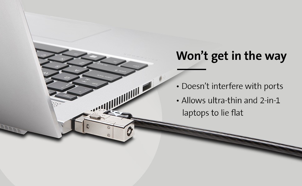 The latest laptops from HP, Lenovo, and Asus increasingly feature the Kensington Nano Security Slot, offering all the security and benefits of the standard Kensington Security Slot™, yet 70% smaller. However, these ultra-thin devices may be so slim that while a standard cable lock will fit, the thickness of the lock can be greater than the laptop itself. This prevents the device from lying flat on a surface, making the keyboard and trackpad uncomfortable to use. With connectivity ports placed closer and closer together, a standard lock can also block adjacent ports, compromising functionality.