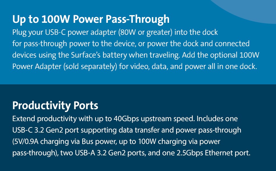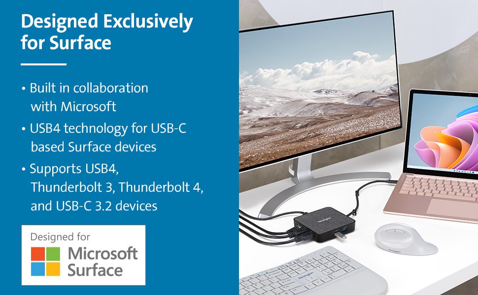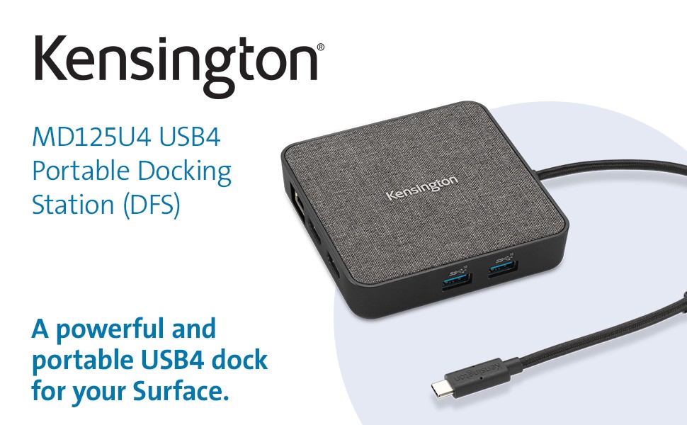 Designed exclusively for Surface, the innovative MD125U4 USB4 Portable Docking Station seizes the power of USB4 technology to maximize productivity, reduce travel bulk, and help you get the most from your Surface—while at your desk or on the go. With all the power of USB4, including Dual 4K support, up to 40Gbps upstream speed, and up to 100W power pass-through, the MD125U4 maximizes your productivity anywhere. An ideal choice for hybrid workers who want to travel with less weight and clutter, power pass-through eliminates the need to travel with an additional power brick, and a variety of productivity ports eliminates the need for additional adapters. At your desk or on the go, the MD125U4 is the perfect mobile dock for your Surface.