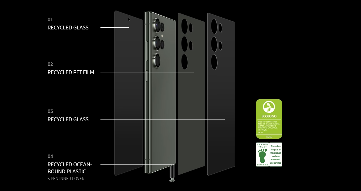 The use of conscious materials makes this our most eco-friendly smartphone ever. 1,2 Recycled glass and PET film accent the phone's exterior, and box made from recycled paper makes it planet-loving from the moment it hits your hands