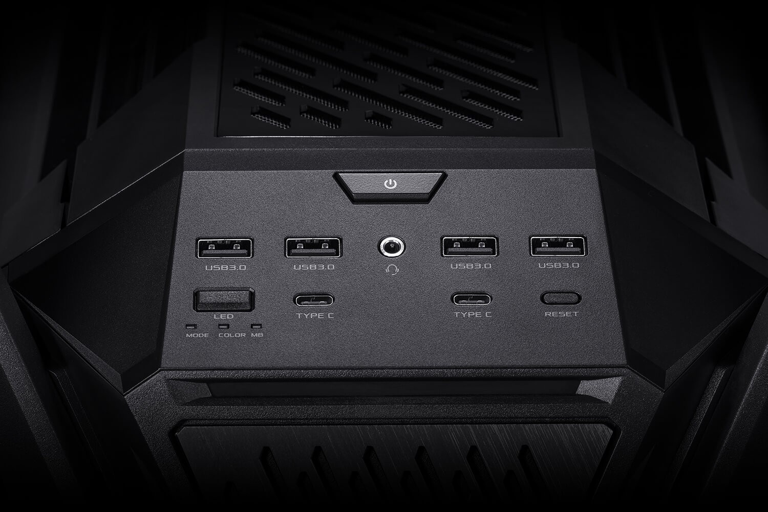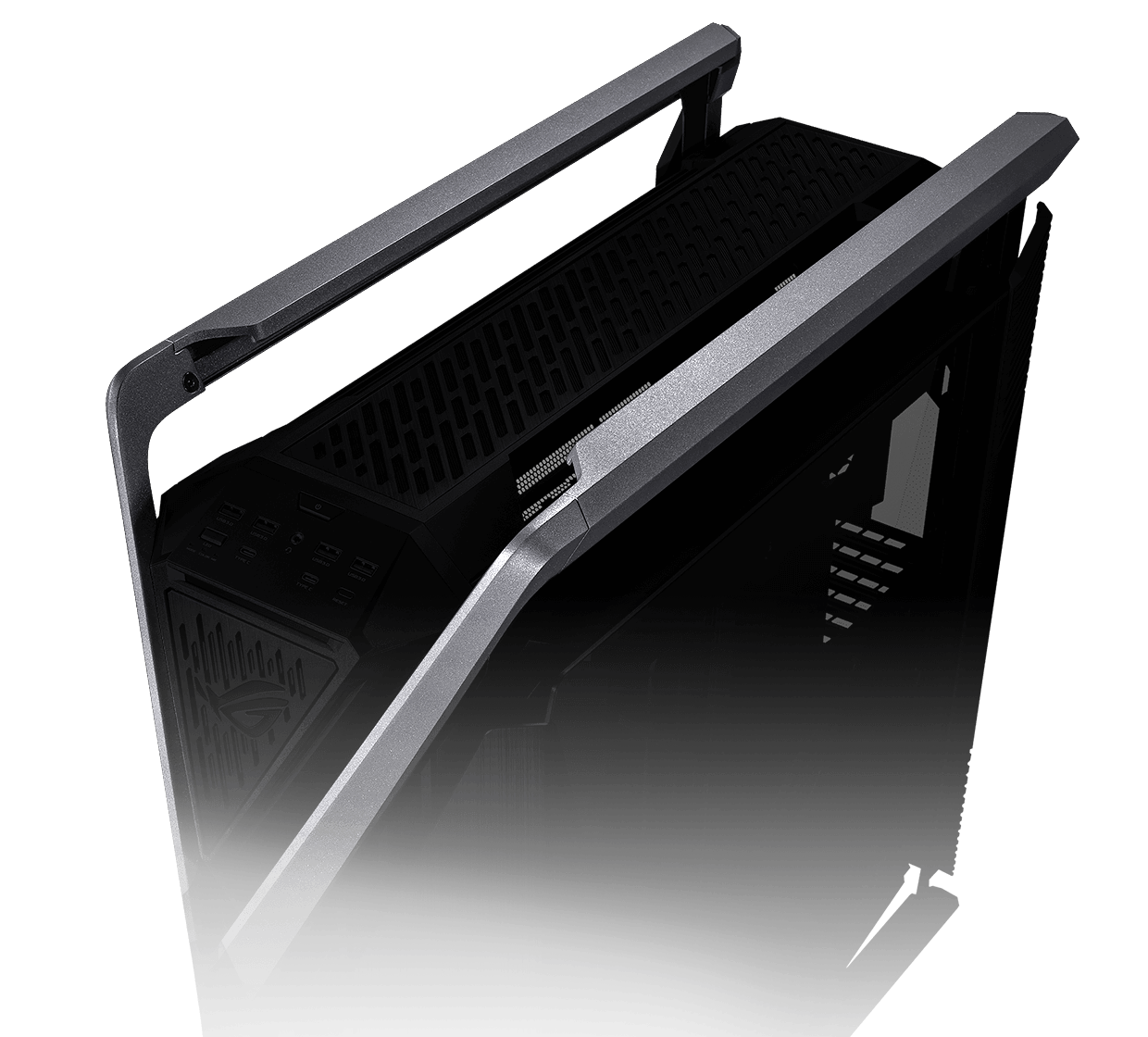 The front of any ROG chassis has to offer a host of connectors, and the ROG Hyperion adds to the tradition with two USB Type-C ® connectors that can offer up to 20 Gbps of data transfer and up 60 watts of fast charging with a compatible motherboard.