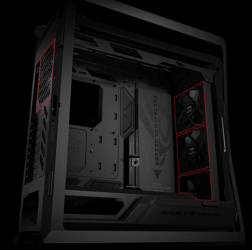 In between the motherboard tray and the front of the chassis sits an innovative vertical installation area that can support a variety of needs. Builders can mount multiple system fans and 2.5-inch SSDs, or a 360 mm radiator, liquid cooling distribution panel, or ROG-themed lighting panel.