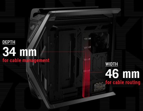 Underneath the motherboard tray area, builders will find a chamber 34 mm deep for their cable management needs, and a cable routing channel that’s 46 mm wide and secured by several ROG-branded Velcro straps to keep things looking tidy for the transparent side panel. This chassis also offers a translucent cable cover that can obscure unsightly wiring while letting your RGB style shine through.