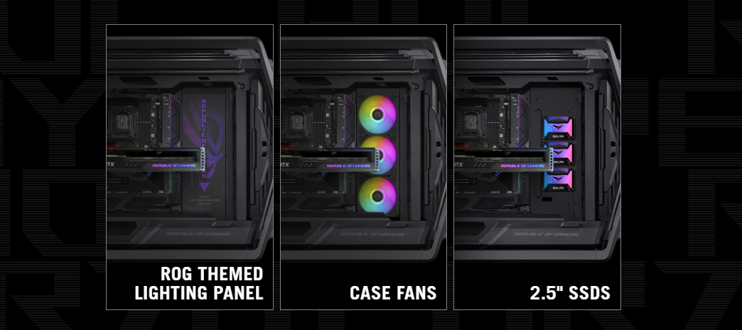 Builders can optionally activate and customize RGB lighting built into an ROG-stamped front panel section, adding to the wealth of personalization built into this chassis.