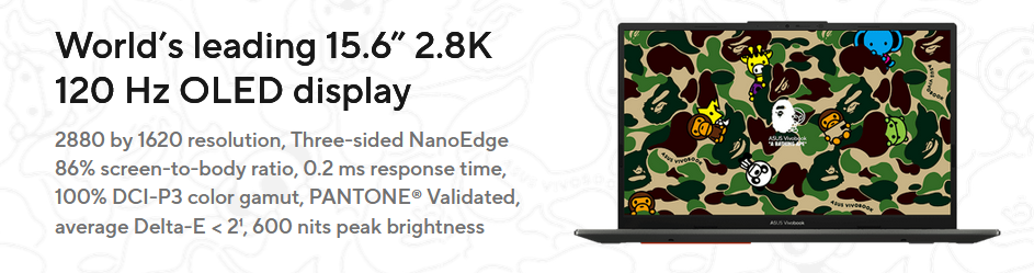 Experience the ultimate combination of street fashion and tech with the Vivobook S 15 OLED BAPE Edition, our groundbreaking collaboration with the renowned streetwear brand, A BATHING APE ® (BAPE ® ). The distinctive and iconic camo and BABY MILO ® print, exclusively created for this collaboration, is now featured not only on the laptop but also on other exceptional accessories such as mouse, carry bag, and figurine. With the dynamic and lively style of Vivobook complementing BAPE ® ’s vivid and dazzling design, this new collaboration is sure to WOW THE WORLD!