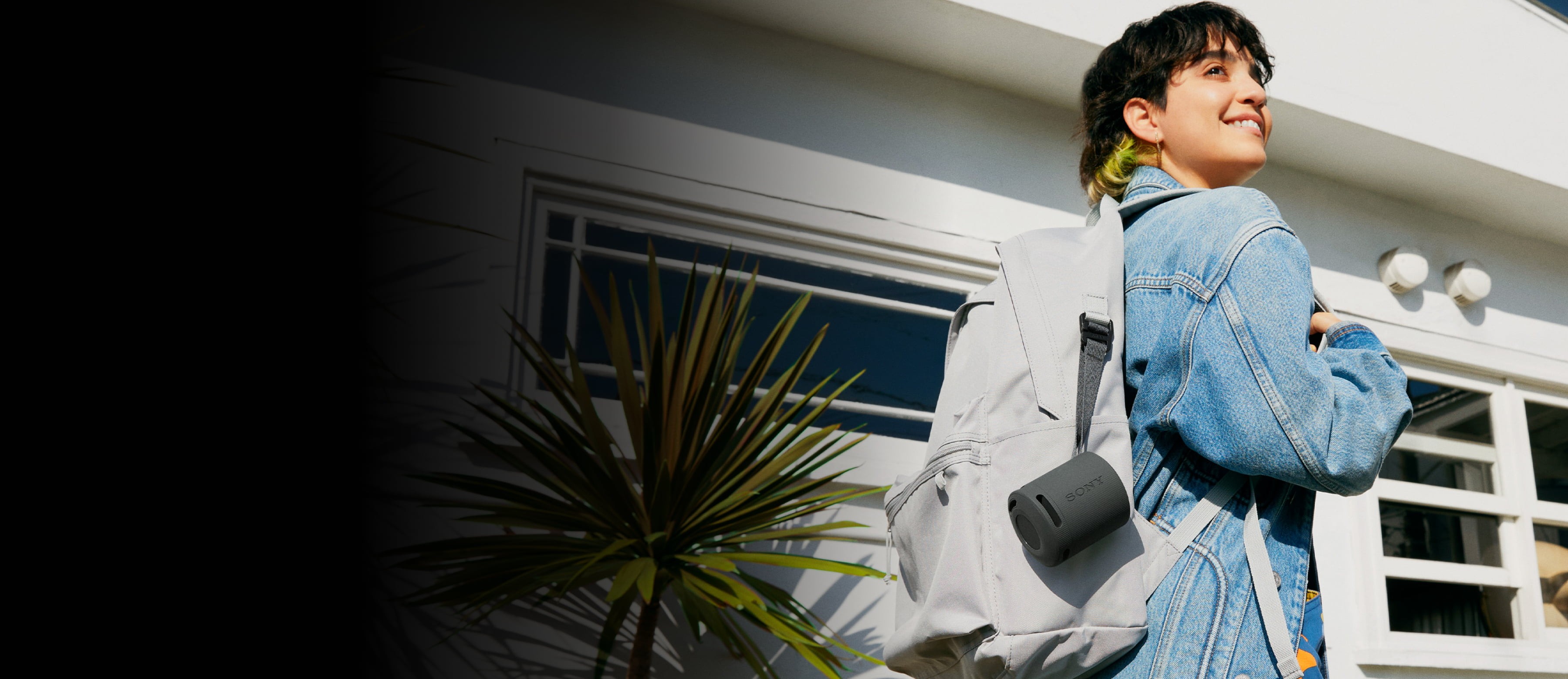 Enjoy big sound with the super-compact SRS-XB100 wireless speaker, offering powerful, clear sound, a waterproof and dustproof design, and up to 16 hours of battery life.