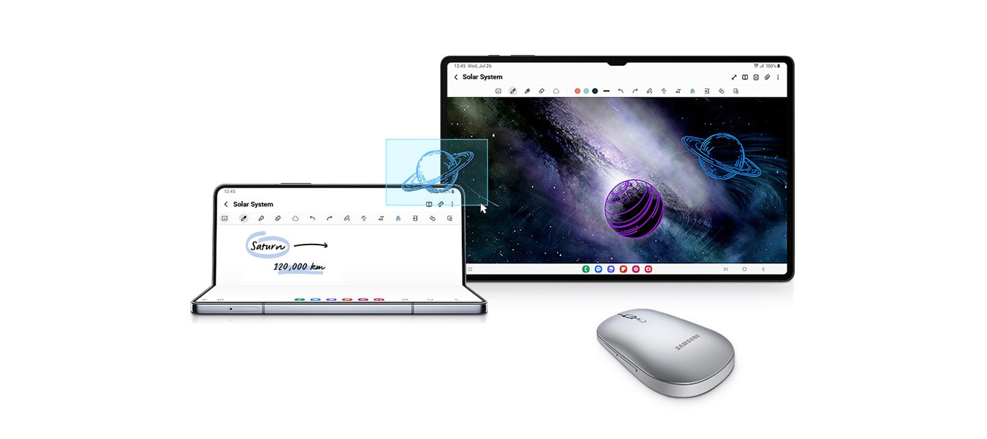 Enjoy seamless compatibility across devices. The Multi Control feature lets you use a keyboard and mouse on devices like your Galaxy Z Fold5 and Galaxy Tab S9, making copy and paste or drag and drop easy. Use your tablet as a second screen and design your mobile workspace efficiently.