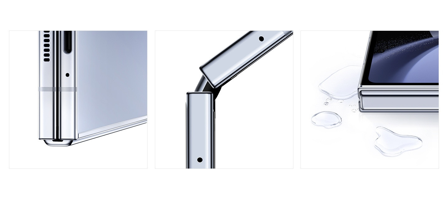 Armor Aluminum: The aluminum frame acts like armor that protects the frame of the Galaxy Z Fold5 from damage. The double flex hinge ensures robust and long-lasting functionality. And well sealed.