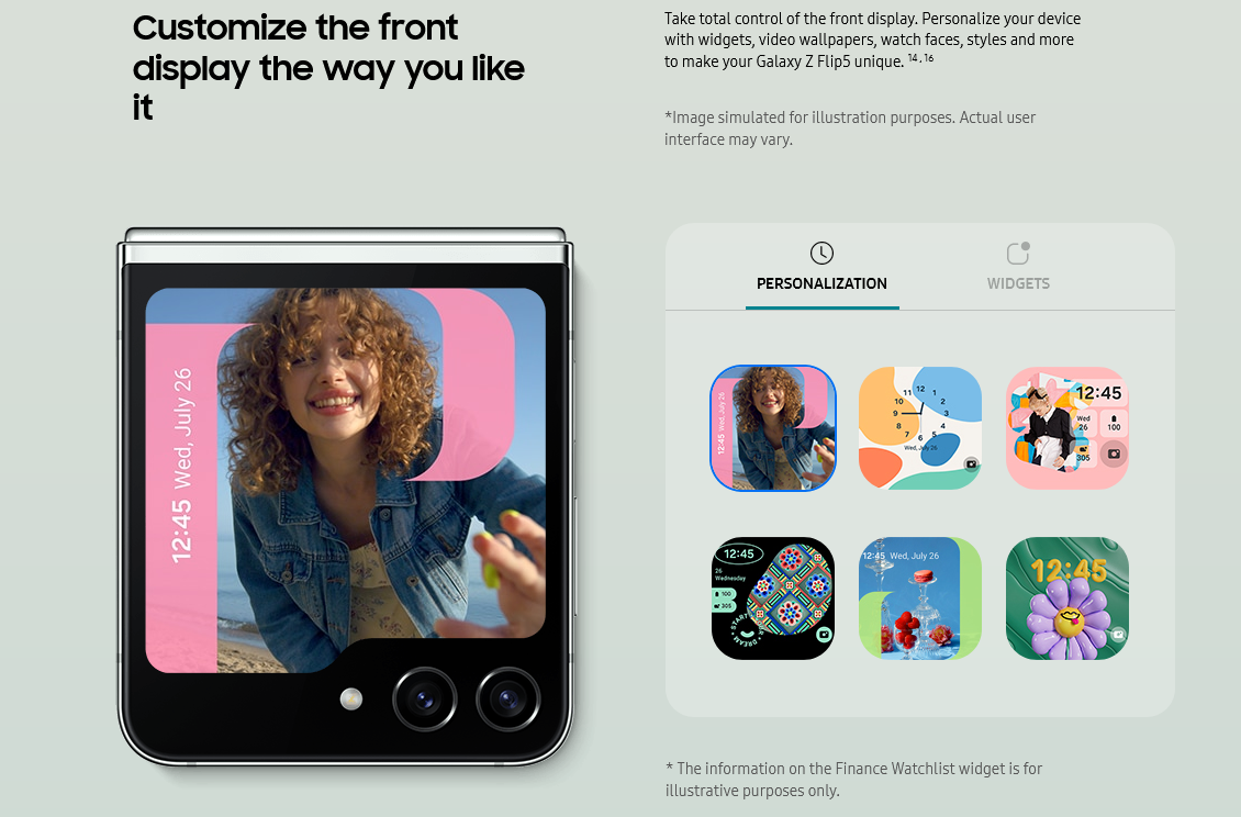 Discover the Galaxy Z Flip5's 3.4-inch front display, designed for self-expression. 1 This compact and eye-catching folding smartphone is as versatile as it is portable.