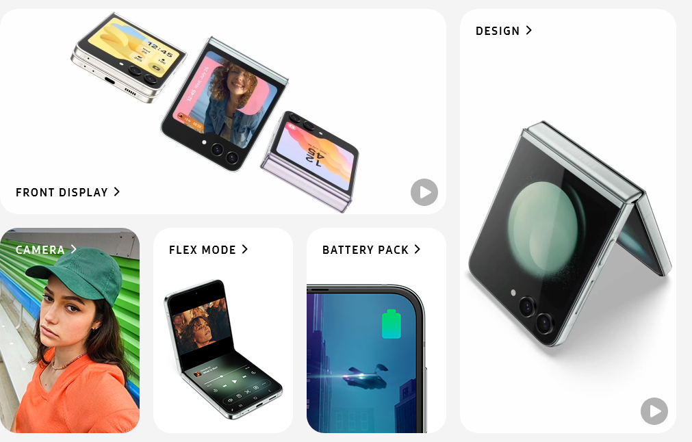 Discover the Galaxy Z Flip5's 3.4-inch front display, designed for self-expression. 1 This compact and eye-catching folding smartphone is as versatile as it is portable.
