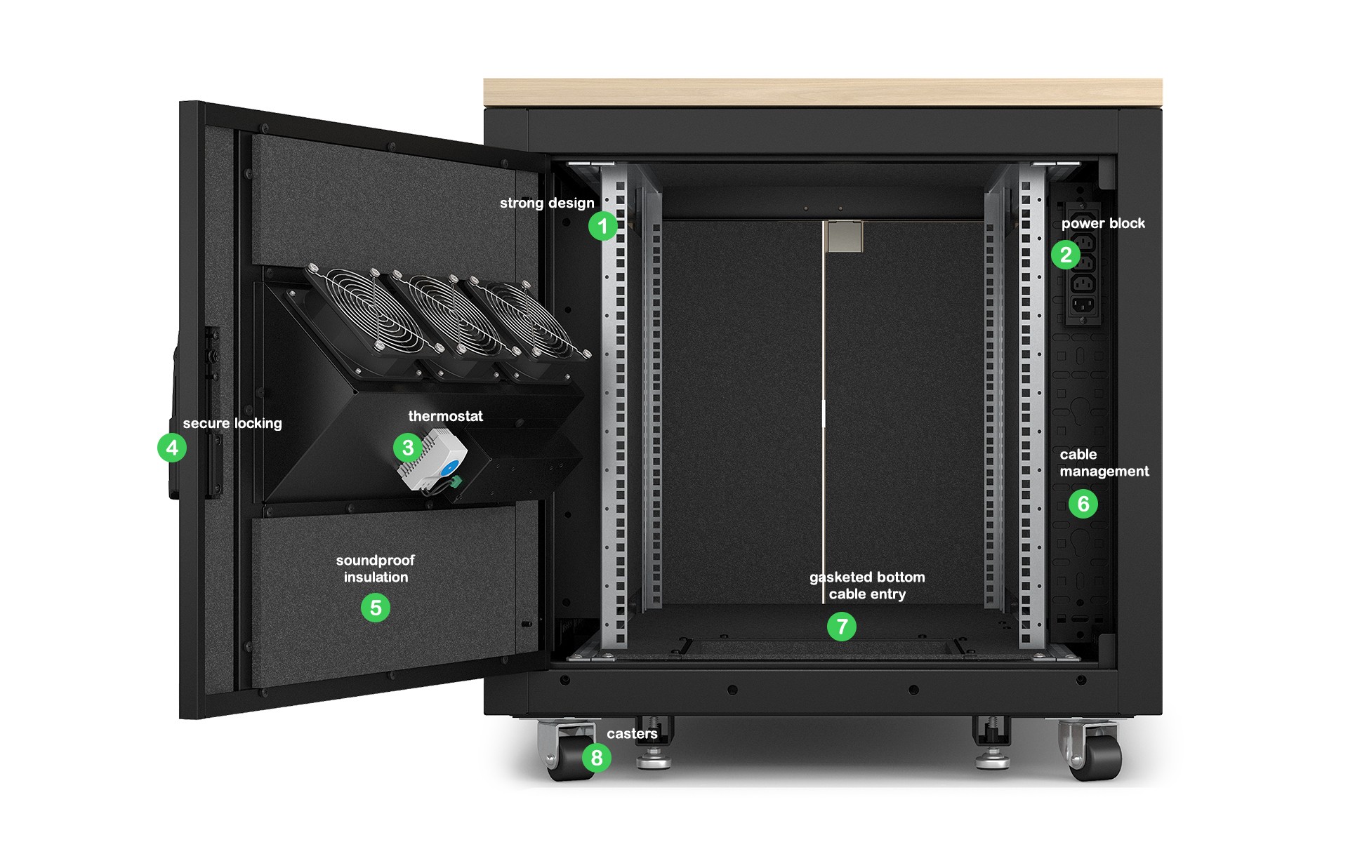 Yes, Soundproof Racks have locking front, rear, and side doors, so IT gear is easily accessible but secure. The discreet furniture look and soundproofing features also help the racks blend into their environment. |