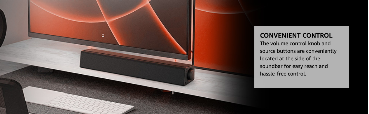 The soundbar features a sleek style and is powered by USB, minimizing clutter on your desktop.