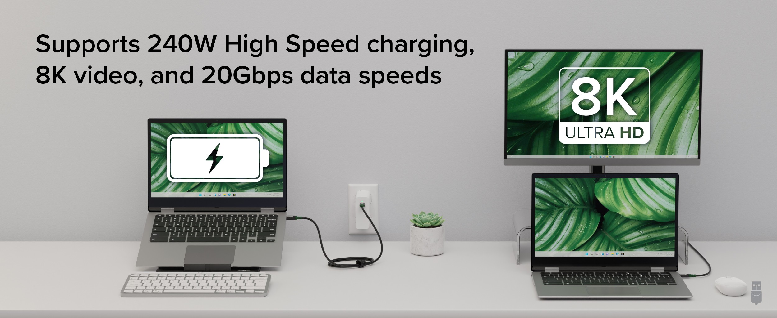 The Plugable USB-C 20Gbps 240W EPR Cable (USBC-240W-1M) is the standard for professional-grade connectivity and power delivery. Designed to be future-proof, this cable supports 240W Extended Power Range (EPR) to charge your high-power devices quickly and efficiently. Its compatibility extends to just about any Thunderbolt, USB4, or USB-C devices, like laptops, smartphones, and docking stations. Blazing-fast data transfer speeds up to 20Gbps let you transfer even the biggest files in seconds.