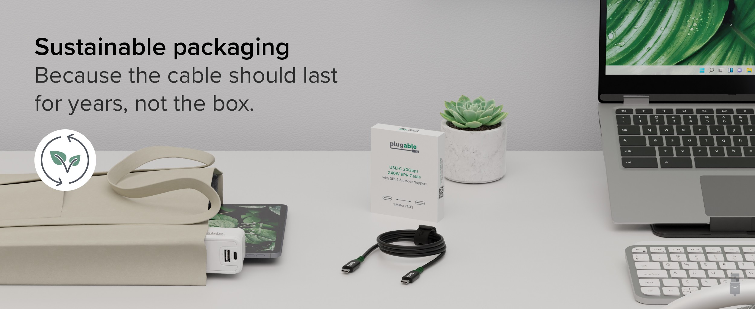 Beyond its impressive performance capabilities, the Plugable cable is crafted with an eye toward sustainability and organization. Its packaging and product design focus on eco-friendliness, utilizing recycled materials to lessen environmental impact. The inclusion of cable management ties offers organized storage when you throw the cord in your laptop bag. With its 3.3ft (1m) length, the Plugable USB-C 20Gbps 240W EPR Cable is an essential tool for tech enthusiasts and professionals alike, offering a future-proof solution that combines power, speed, and sustainability.