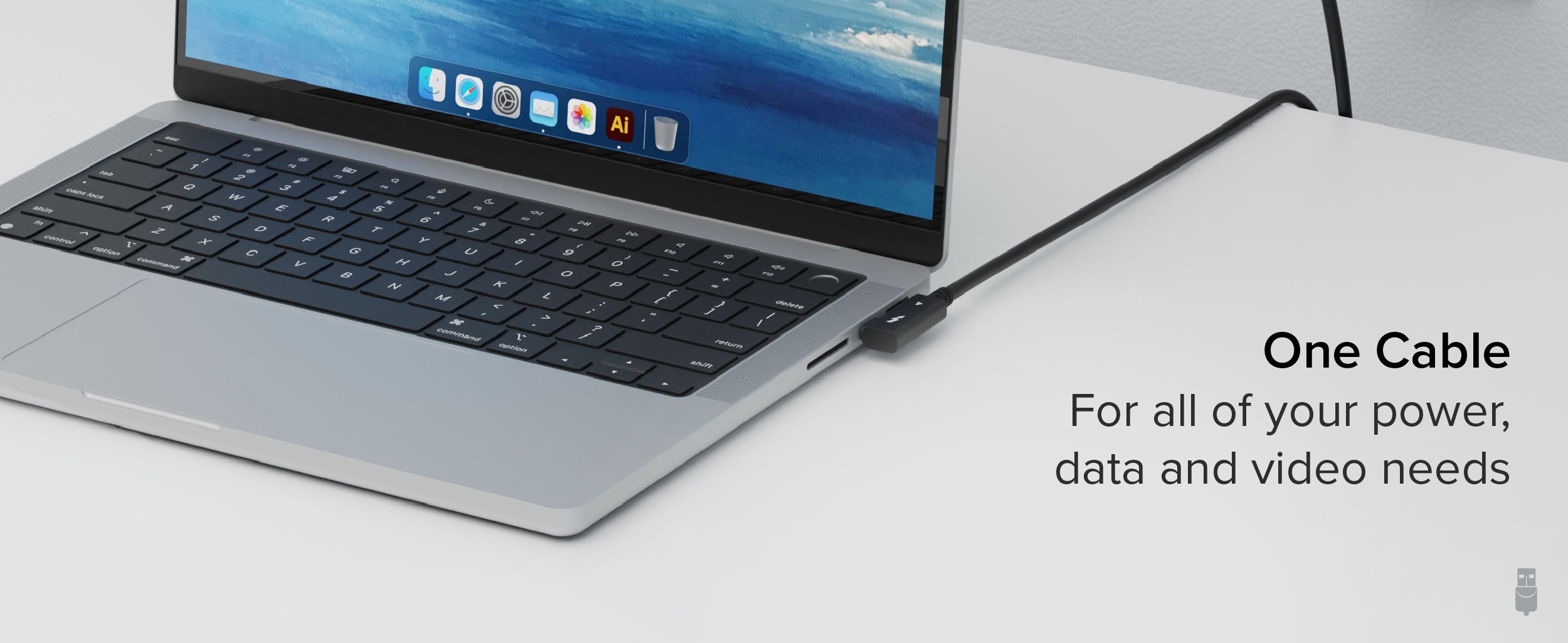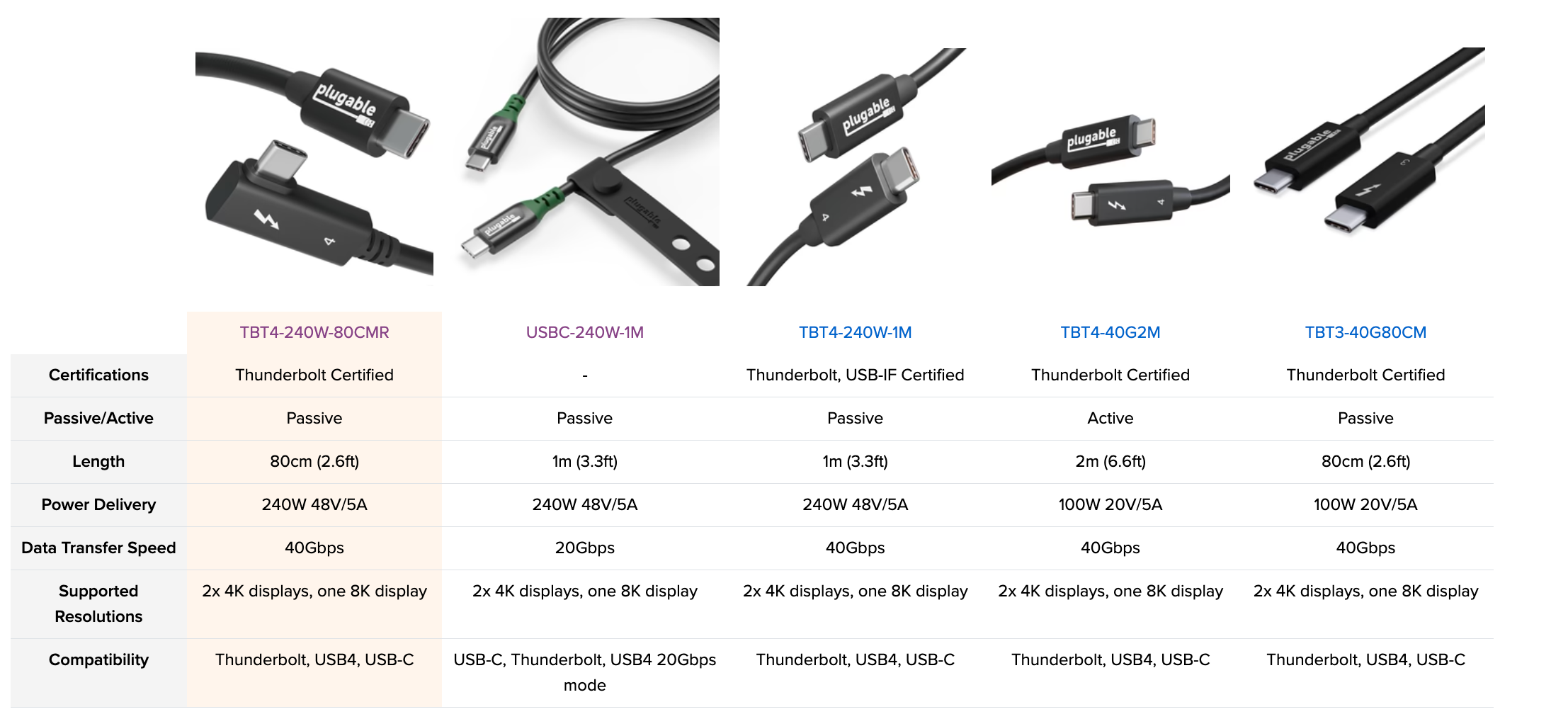 The Plugable Thunderbolt 4 240W Cable with Right Angle Connector (TBT4-240W-80CMR) is the standard for professional-grade connectivity and power delivery ( PD ). But how important is a “professional grade” cord? More than you might think. Connecting a laptop to a docking station, SSD, or any other accessory is only as efficient as the weakest link in the chain. A low-quality cable will severely limit compatibility, the flow of data, and power between the linked devices. Even something as simple as charging your phone can be slowed by a low-quality cable. That’s where the TBT4-240W-80CMR Cable Thunderbolt 4 stands out from the crowd.