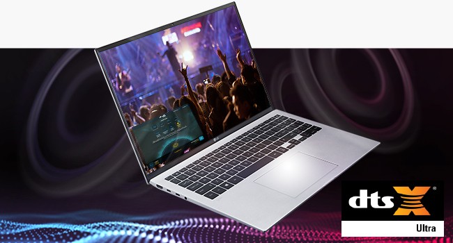 DTS:X Ultra allows you to immerse yourself in 3D Audio Rendering even without wearing headphones, to enjoy a full and rich audio experience. LG gram features upgraded hardware with smart amp and stereo speakers, delivering powerful sound.