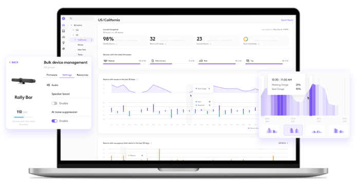 Easily manage and maintain all your devices and spaces at scale with Logitech Sync. Monitor room health, deploy updates, and modify settings all from a single cloud-based platform. Activate premium features like insights, remote UI for troubleshooting, and proactive alerts with an Essential or Select license.