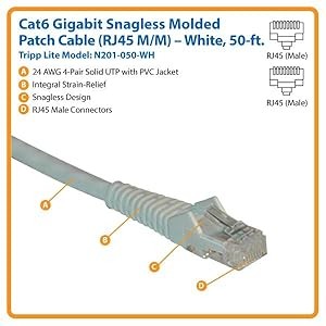 Manufactured from 24 AWG 4-pair solid UTP with a staggered-pin plug design, the N201-050-WH provides high-speed connections and flawless signal delivery while keeping near-end crosstalk levels to a minimum. This cable can deliver speeds up to 550MHz/1 Gbps. Featuring a PVC jacket, this 50-ft. Tripp Lite Cat6 Gigabit Snagless Molded Patch Cable is constructed of top-quality materials for long life and durability. Its RJ45 (male) connectors are gold-plated for an accurate signal transfer. For a secure connection, this cable has molded integral strain-relief and a snagless design that protects the locking tabs on the RJ45 connectors from being damaged or snapped off during installation. The N201-050-WH meets the most current industry standards, including IEEE 802.3ab, IEEE 802.5, ANSI/EIA/TIA 568, ISO/IEC 11801 and ETL (category 6 draft 11).