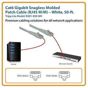 For peace of mind, this 50-ft. Tripp Lite Cat6 Gigabit Snagless Molded Patch Cable comes backed by a lifetime warranty. The N201-050-WH is manufactured in compliance with strict RoHS specifications, reflecting Tripp Lite’s commitment to environmental responsibility.