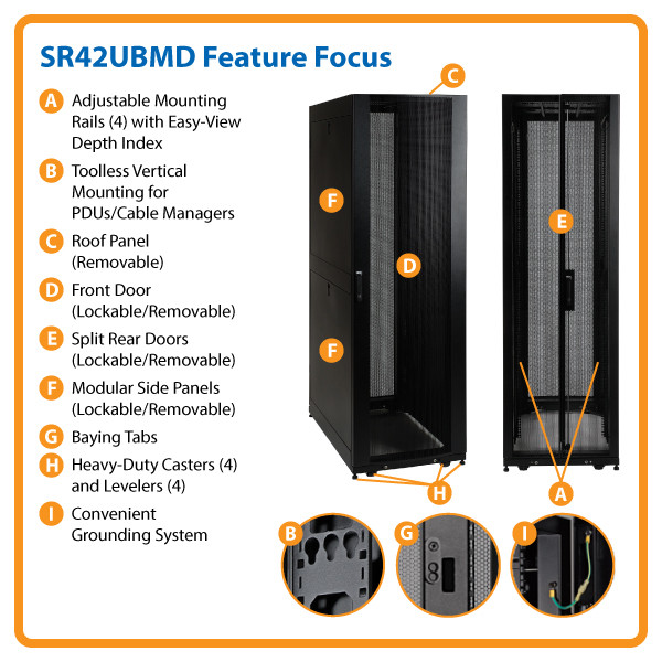 Tripp Lite's SR42UBMD is the ideal solution for servers, blade server chassis, network switches and other dense networking environments where physical space is an issue. This premium 42U enclosure cabinet is packed with features designed to simplify rack equipment installations and rack equipment maintenance: shallower depth, top-panel cable routing ports, perforated doors to promote efficient airflow, adjustable mounting rails, toolless vertical PDU mounting and more. And as part of the SmartRack® family, the SR42UBMD is compatible with Tripp Lite's extensive range of rackmount accessories, enabling you to customize your solution to meet any requirement. The SR42UBMD ships fully assembled for quick installation and comes with a 5-year warranty.