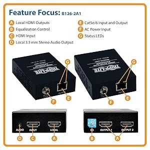 The B126-2A1 extends an HDMI signal beyond the 15-ft. (5-meter) distance limitation. It can extend a 1080i (60Hz) signal up to 200 ft., a 1080p (60Hz) signal up to 150 ft., and a 3D signal up to 125 ft. You can add up to three B126-110 repeater units on each Cat5e/6 channel for a total of 4 displays per channel (an active remote receiver should be the last unit in a channel). For each repeater added into a channel, a 1080i (60Hz) signal can extend up to 175 ft. and a 1080p (60Hz) signal can extend up to 125 ft. Additionally, the B126-2A1 is compatible with both stereo and 7.1 channel surround sound audio, delivering premium sound quality to every point of your application. For optimal distance and resolution, use 24 AWG solid-wire Cat5e/6 cable (Tripp Lite N202-series).