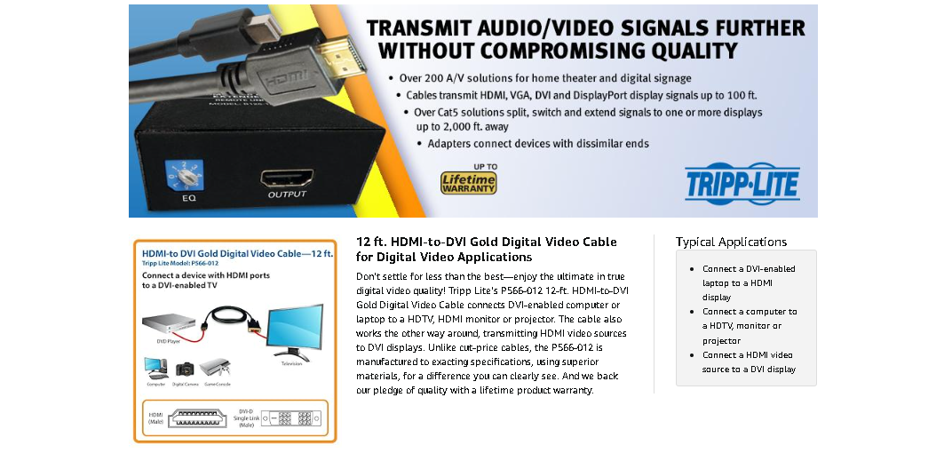 When you choose this genuine Tripp Lite cable, you get superior performance plus peace of mind! We’re so confident of the quality of the P566-012 that we warrant it to be free from defects in material and workmanship—for life! Additionally, the P566-012 is manufactured in compliance with strict RoHS specifications, reflecting Tripp Lite’s commitment to environmental responsibility.