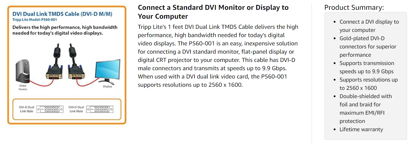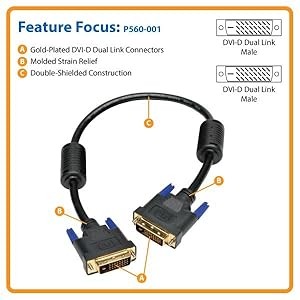 The P560-001 is manufactured using top-quality materials. It features gold-plated DVI-D connectors with gold-plated copper contacts to ensure excellent conductivity. This cable is also double-shielded with foil and braid for maximum EMI/RFI protection. The connectors are molded and have strain relief for durability and long life.