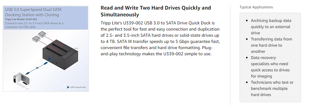 The U339-002 is plug-and-play ready. With no drivers or software to install, simply plug it in, connect the included USB cable to your PC or Mac, and insert the SATA drives you want to use. You can read and write to both drives at the same time. The U339-002’s docking function works with Windows, Linux and Mac OS X operating systems.